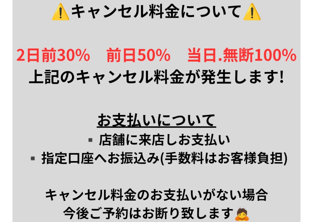 こちらからご連絡しても繋がらず、キャンセル料金のお支払いがない場合は、今後のご予約はお断りさせて頂きます🙇